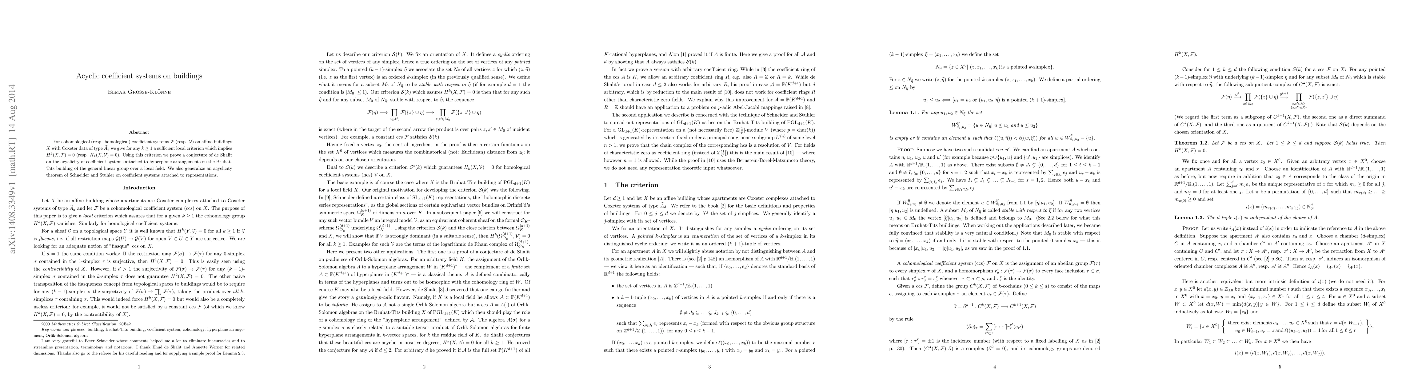 For cohomological (resp. homological) coefficient systems ${\mathcal F}$ (resp. ${\mathcal V}$) on affine buildings $X$ with Coxeter data of type $\widetilde{A}_d$ we give for any $k\ge1$ a sufficient local criterion which implies $H^k(X,{\mathcal F})=0$ (resp. $H_k(X,{\mathcal V})=0)$. Using this criterion we prove a conjecture of de Shalit on the acyclicity of coefficient systems attached to hyperplane arrangements on the Bruhat-Tits building of the general linear group over a local field. We also generalize an acyclicity theorem of Schneider and Stuhler on coefficient systems attached to representations.