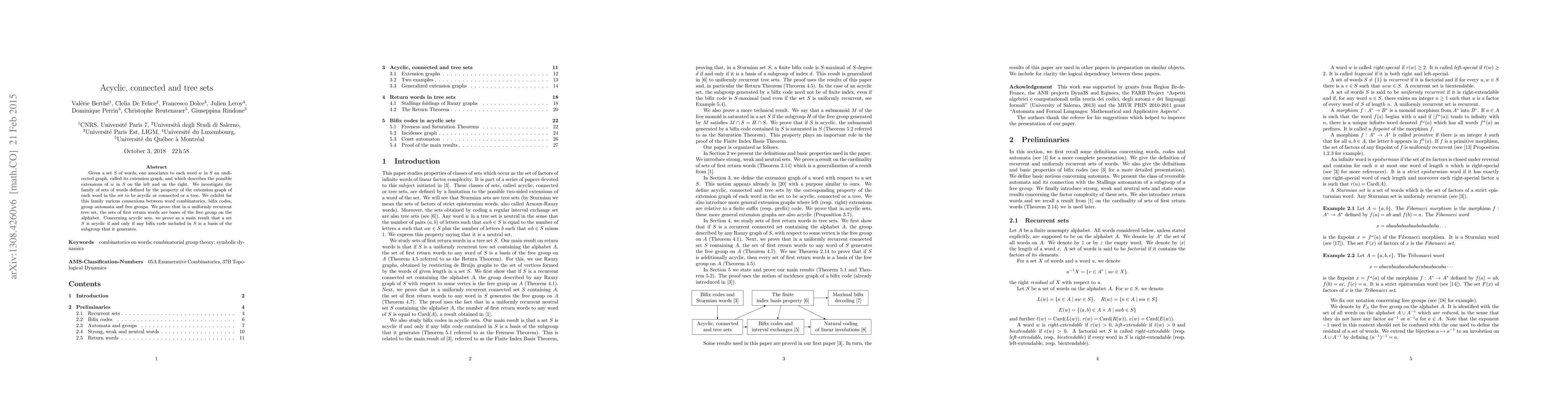 This paper explores sets of words where each word's extension graph is acyclic, connected, or a tree. It establishes that in uniformly recurrent tree sets, the sets of first return words form bases of the free group on the alphabet, and proves that acyclic sets have the property that any bifix code within them is a basis of the subgroup it generates.