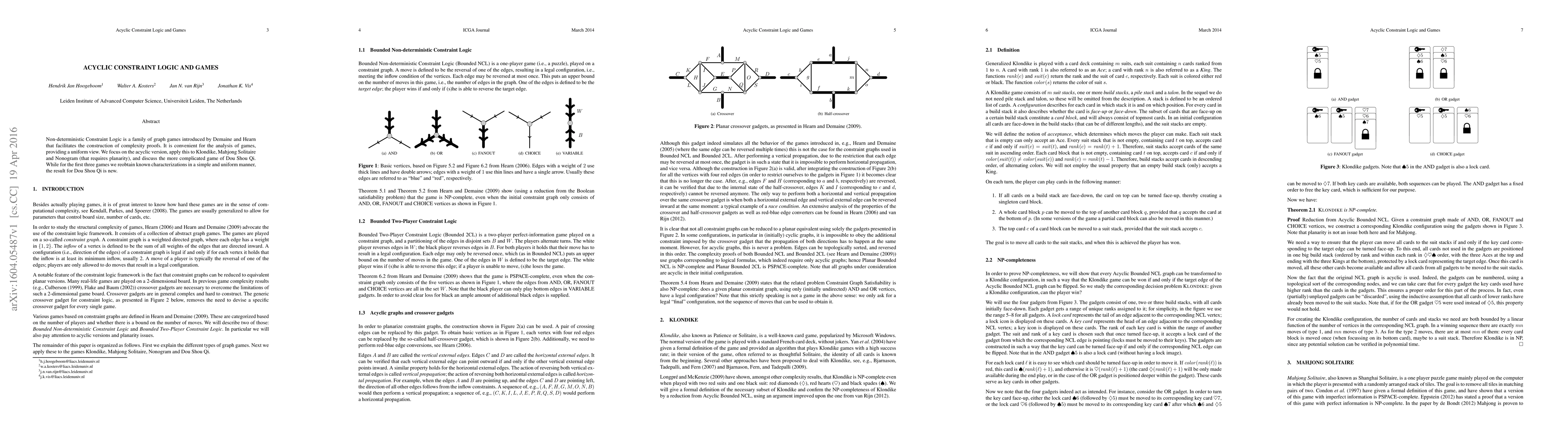 Non-deterministic Constraint Logic is a family of graph games introduced by Demaine and Hearn that facilitates the construction of complexity proofs. It is convenient for the analysis of games, providing a uniform view. We focus on the acyclic version, apply this to Klondike, Mahjong Solitaire and Nonogram (that requires planarity), and discuss the more complicated game of Dou Shou Qi. While for the first three games we reobtain known characterizations in a simple and uniform manner, the result for Dou Shou Qi is new.