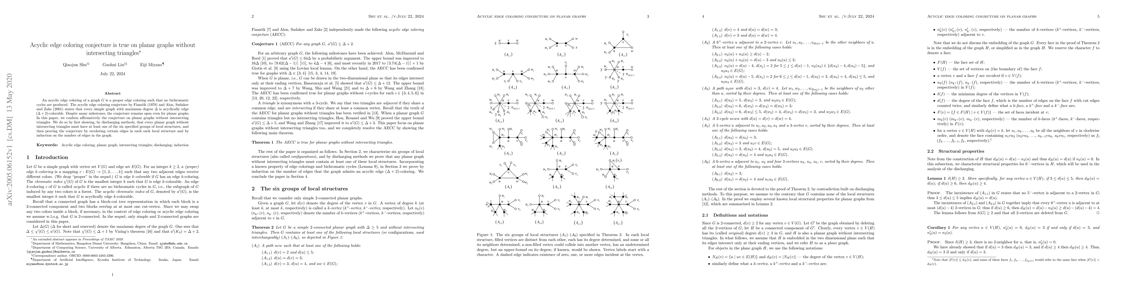 This paper confirms the acyclic edge coloring conjecture for planar graphs without intersecting triangles by identifying specific local structures and using recoloring techniques and induction. The result leverages discharging methods to demonstrate the presence of particular configurations in these graphs.