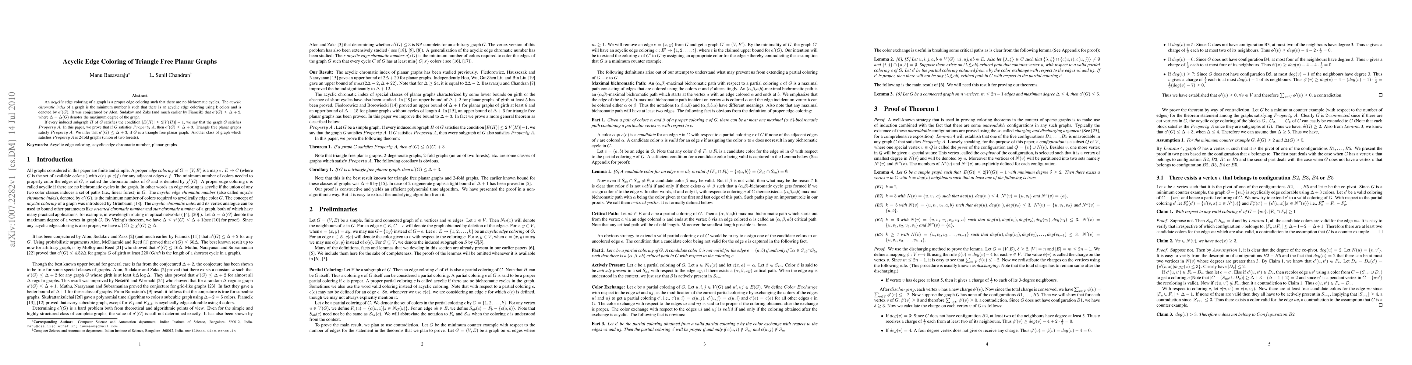 This paper proves that the acyclic chromatic index $a'(G)$ of triangle free planar graphs is at most $\Delta + 3$, where $\Delta$ is the maximum degree. It establishes this by showing that such graphs satisfy Property A, which helps derive the upper bound on $a'(G)$.