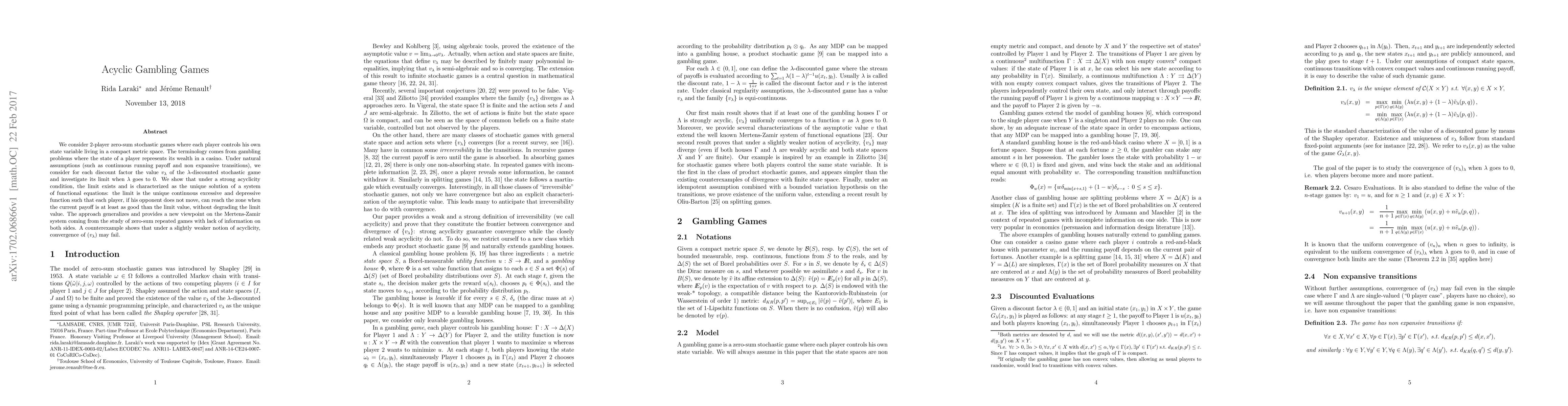 We consider 2-player zero-sum stochastic games where each player controls his own state variable living in a compact metric space. The terminology comes from gambling problems where the state of a player represents its wealth in a casino. Under natural assumptions (such as continuous running payoff and non expansive transitions), we consider for each discount factor the value v $\lambda$ of the $\lambda$-discounted stochastic game and investigate its limit when $\lambda$ goes to 0. We show that under a strong acyclicity condition, the limit exists and is characterized as the unique solution of a system of functional equations: the limit is the unique continuous excessive and depressive function such that each player, if his opponent does not move, can reach the zone when the current payoff is at least as good than the limit value, without degrading the limit value. The approach generalizes and provides a new viewpoint on the Mertens-Zamir system coming from the study of zero-sum repeated games with lack of information on both sides. A counterexample shows that under a slightly weaker notion of acyclicity, convergence of (v $\lambda$) may fail.