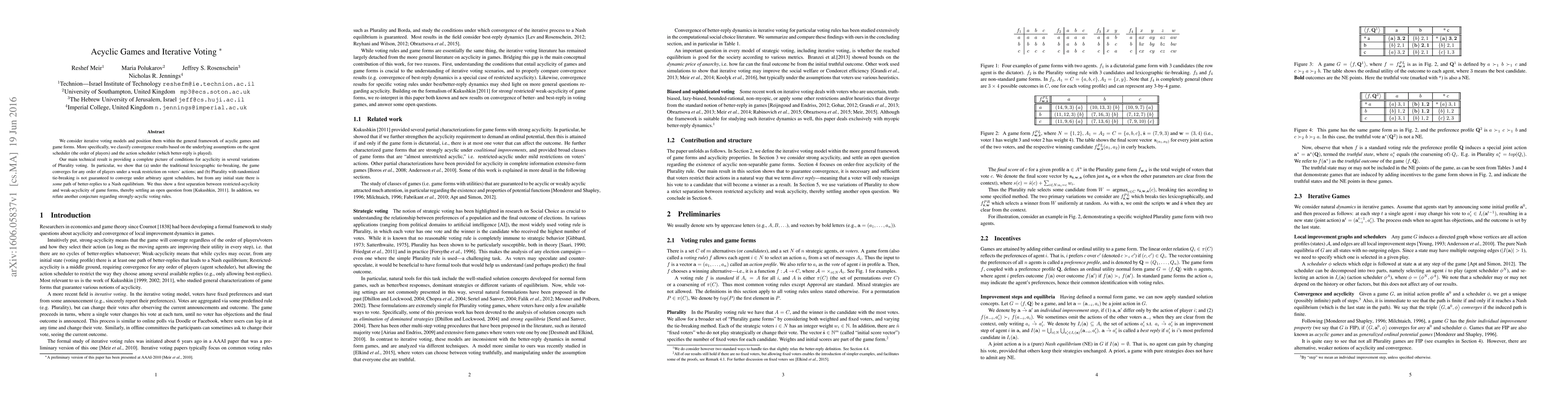 This paper explores iterative voting models within the context of acyclic games, classifying convergence results based on player and action scheduler assumptions. It demonstrates that traditional Plurality voting converges under lexicographic tie-breaking, while Plurality with randomized tie-breaking may not converge universally but always has a path to a Nash equilibrium, establishing a distinction between restricted-acyclicity and weak-acyclicity.