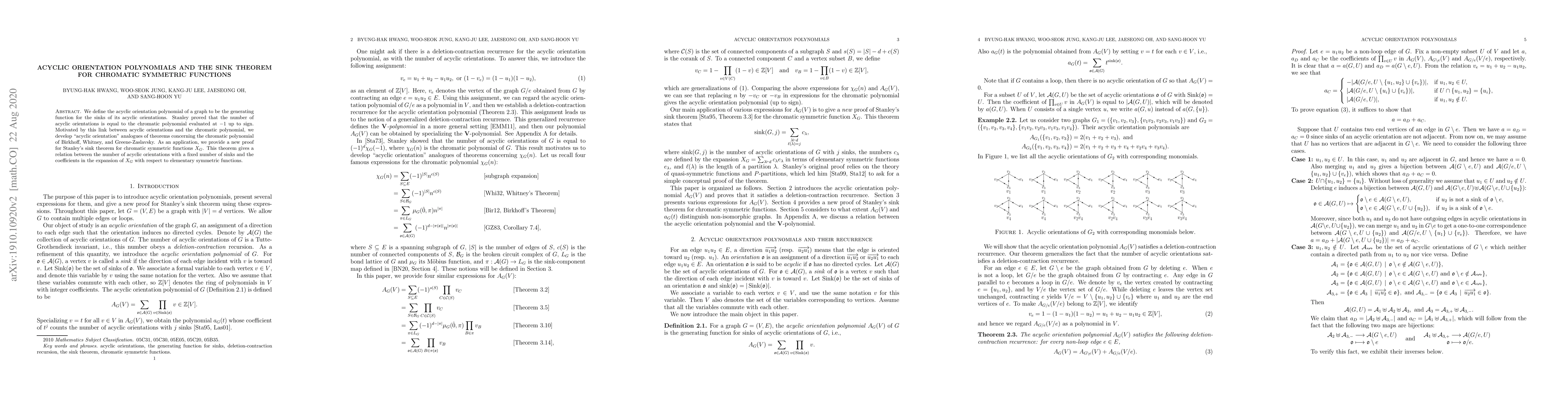 This paper introduces the acyclic orientation polynomial, a generating function for sinks in acyclic orientations of a graph, and explores its connections to the chromatic polynomial. It develops analogous theorems for acyclic orientations and provides a new proof for Stanley's sink theorem concerning chromatic symmetric functions.