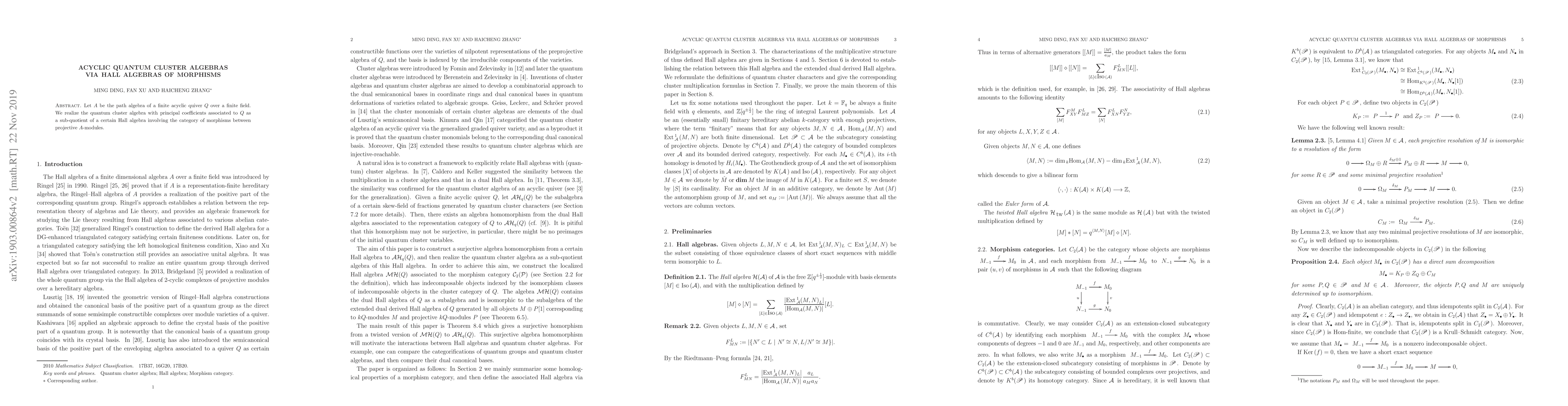 This paper establishes a connection between acyclic quantum cluster algebras and Hall algebras, showing that the former can be realized as a sub-quotient of a Hall algebra constructed from morphisms between projective modules over the path algebra of a finite acyclic quiver.
