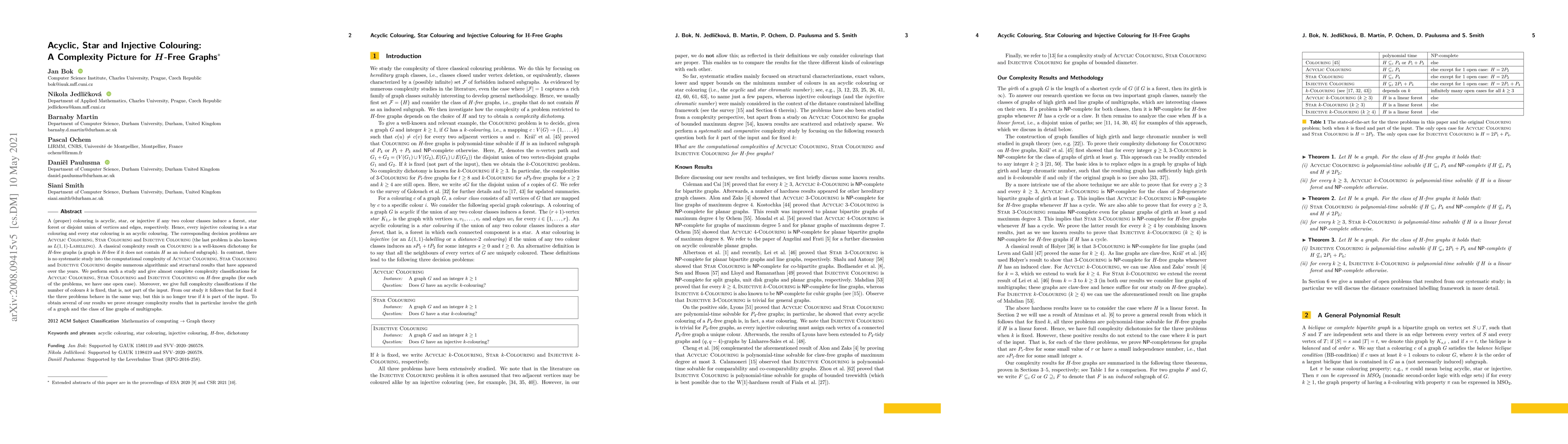 This paper classifies the computational complexity of Acyclic Colouring, Star Colouring, and Injective Colouring for $H$-free graphs, providing almost complete complexity classifications for each problem, with one open case remaining. It shows that when the number of colours $k$ is fixed, these problems behave similarly, but differ in complexity if $k$ is part of the input.