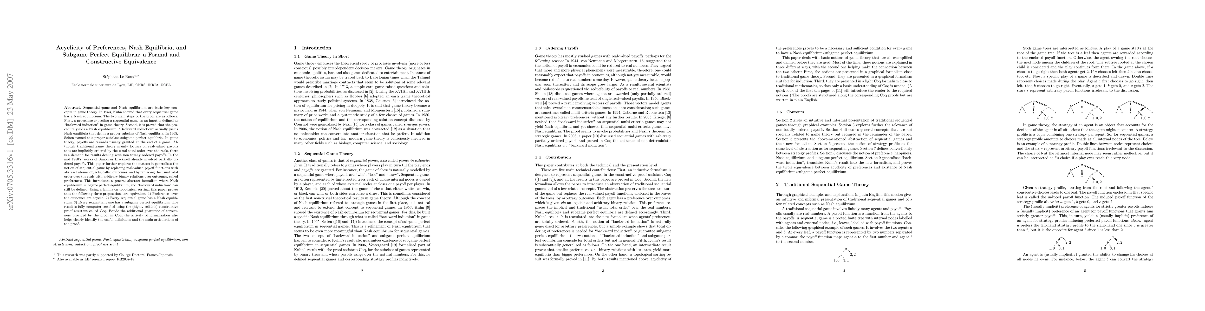 This paper generalizes sequential games to abstract outcomes and arbitrary preference relations, proving the equivalence of acyclicity of preferences, the existence of Nash equilibria, and subgame perfect equilibria in this framework, all formally verified using Coq. The formalization aids in clarifying the definitions and proof structure.