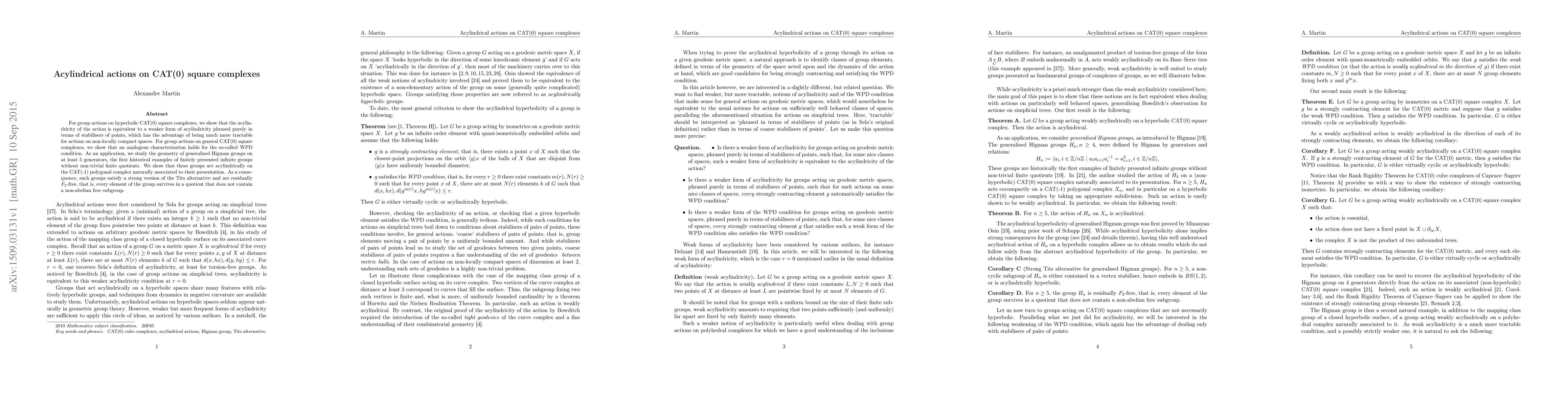 For group actions on hyperbolic CAT(0) square complexes, we show that the acylindricity of the action is equivalent to a weaker form of acylindricity phrased purely in terms of stabilisers of points, which has the advantage of being much more tractable for actions on non-locally compact spaces. For group actions on general CAT(0) square complexes, we show that an analogous characterisation holds for the so-called WPD condition. As an application, we study the geometry of generalised Higman groups on at least $5$ generators, the first historical examples of finitely presented infinite groups without non-trivial finite quotients. We show that these groups act acylindrically on the CAT(-1) polygonal complex naturally associated to their presentation. As a consequence, such groups satisfy a strong version of the Tits alternative and are residually $F_2$-free, that is, every element of the group survives in a quotient that does not contain a non-abelian free subgroup.