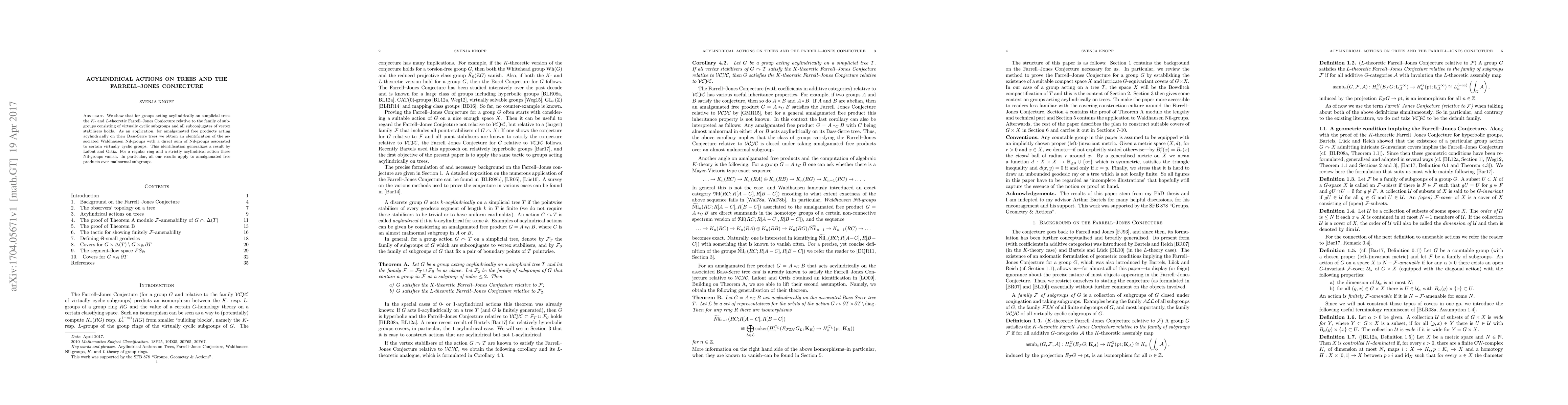 The paper demonstrates the validity of the Farrell-Jones Conjecture in $K$ and $L$ theory for groups acting acylindrically on trees, with an application to identifying Waldhausen Nil-groups for amalgamated free products. It shows these Nil-groups vanish for regular rings under strictly acylindrical actions, extending results for amalgamated free products over malnormal subgroups.
