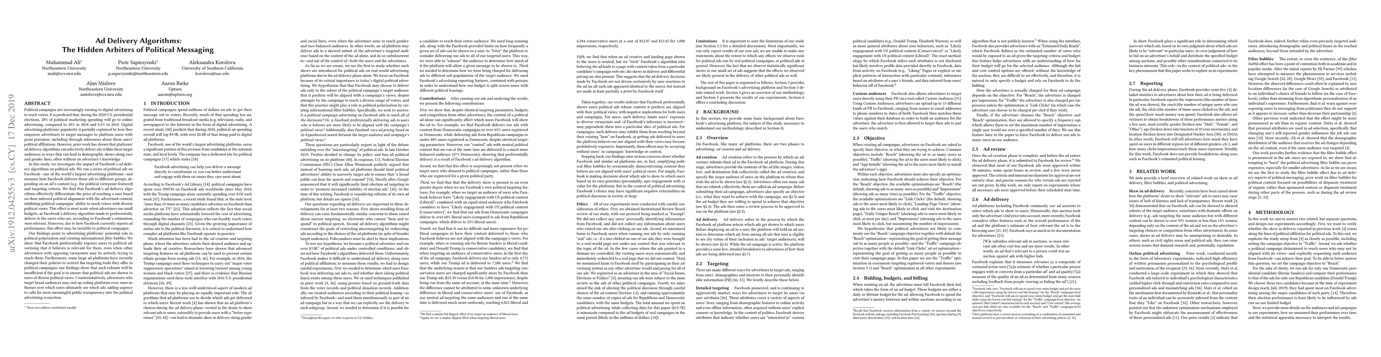This study investigates how Facebook's ad delivery algorithms affect political ad reach, revealing that the platform's algorithms can skew political messaging along demographic lines, particularly when small budgets are used. The findings highlight the potential role of ad platforms in political polarization and suggest that recent policy changes may not sufficiently address the issue of diverse political viewpoints.