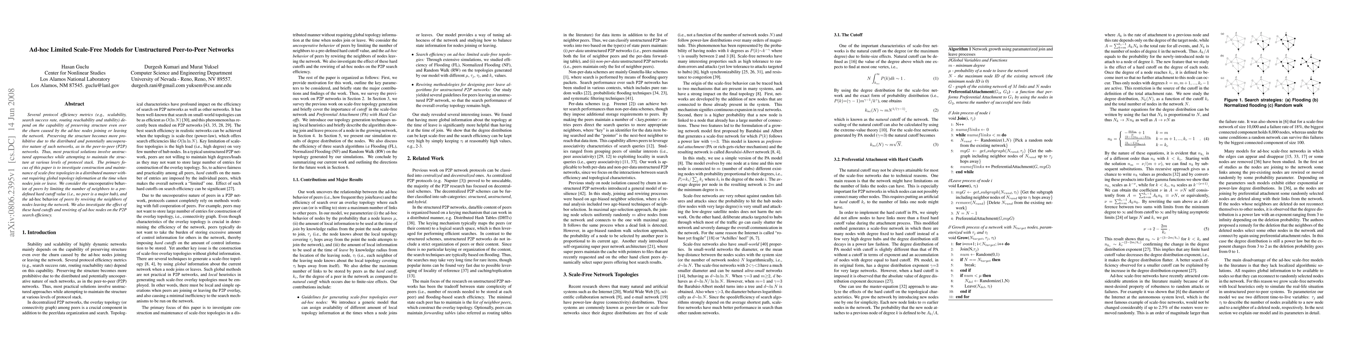 Several protocol efficiency metrics (e.g., scalability, search success rate, routing reachability and stability) depend on the capability of preserving structure even over the churn caused by the ad-hoc nodes joining or leaving the network. Preserving the structure becomes more prohibitive due to the distributed and potentially uncooperative nature of such networks, as in the peer-to-peer (P2P) networks. Thus, most practical solutions involve unstructured approaches while attempting to maintain the structure at various levels of protocol stack. The primary focus of this paper is to investigate construction and maintenance of scale-free topologies in a distributed manner without requiring global topology information at the time when nodes join or leave. We consider the uncooperative behavior of peers by limiting the number of neighbors to a pre-defined hard cutoff value (i.e., no peer is a major hub), and the ad-hoc behavior of peers by rewiring the neighbors of nodes leaving the network. We also investigate the effect of these hard cutoffs and rewiring of ad-hoc nodes on the P2P search efficiency.