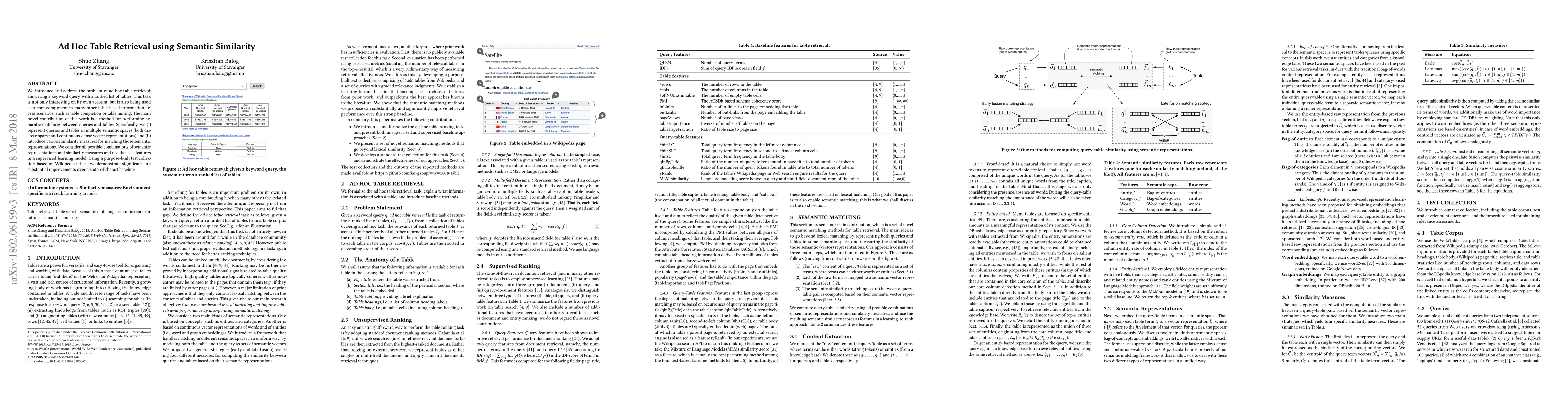 This paper presents a method for ad hoc table retrieval using semantic similarity, employing multiple semantic representations and similarity measures to match queries and tables. The approach significantly outperforms existing baselines in retrieving relevant tables for keyword queries.
