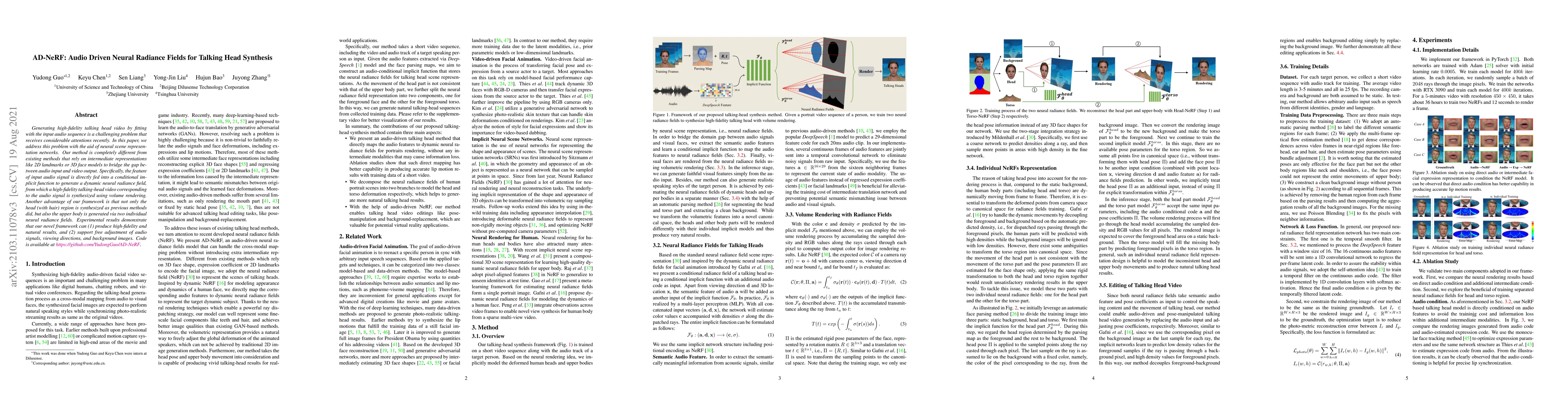 AD-NeRF synthesizes high-fidelity talking head videos directly from audio inputs using neural radiance fields, bypassing intermediate representations like 2D landmarks or 3D models. The method generates both head and upper body regions, offering natural results and flexibility in audio adjustments, viewing directions, and backgrounds.