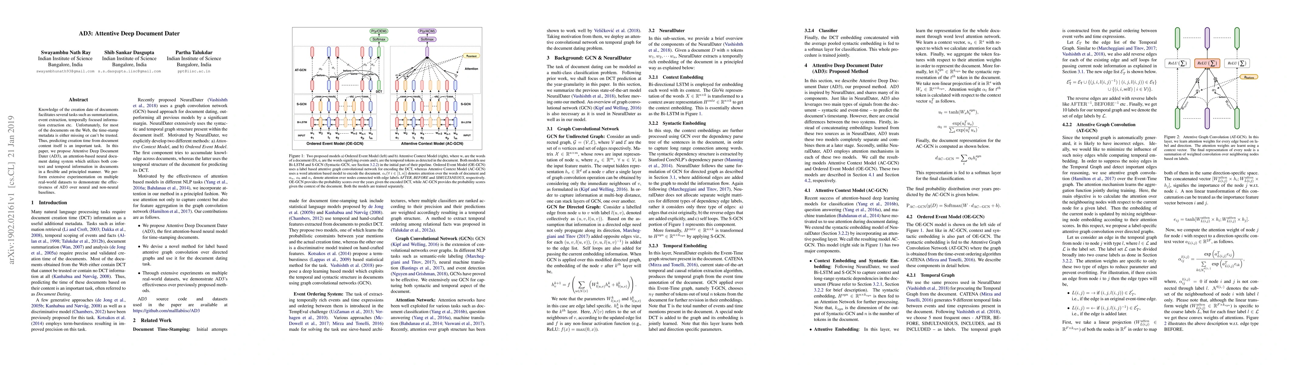 The paper introduces AD3, an attention-based neural network for predicting the creation date of documents from their content. The model leverages both contextual and temporal information and outperforms both neural and non-neural baselines in various real-world datasets.