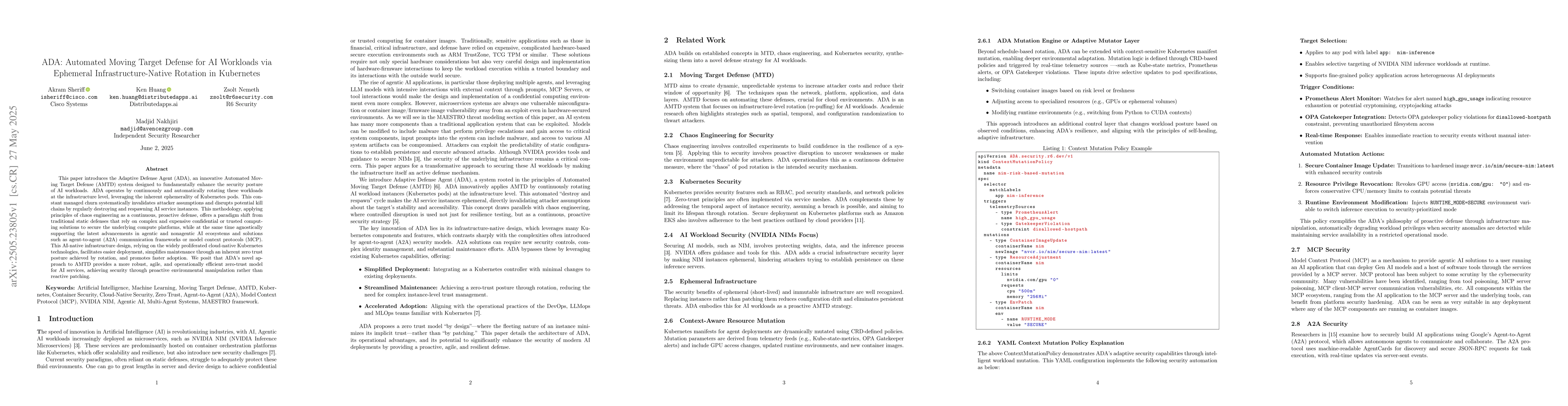 This paper introduces the Adaptive Defense Agent (ADA), an innovative Automated Moving Target Defense (AMTD) system designed to fundamentally enhance the security posture of AI workloads. ADA operates by continuously and automatically rotating these workloads at the infrastructure level, leveraging the inherent ephemerality of Kubernetes pods. This constant managed churn systematically invalidates attacker assumptions and disrupts potential kill chains by regularly destroying and respawning AI service instances. This methodology, applying principles of chaos engineering as a continuous, proactive defense, offers a paradigm shift from traditional static defenses that rely on complex and expensive confidential or trusted computing solutions to secure the underlying compute platforms, while at the same time agnostically supporting the latest advancements in agentic and nonagentic AI ecosystems and solutions such as agent-to-agent (A2A) communication frameworks or model context protocols (MCP). This AI-native infrastructure design, relying on the widely proliferated cloud-native Kubernetes technologies, facilitates easier deployment, simplifies maintenance through an inherent zero trust posture achieved by rotation, and promotes faster adoption. We posit that ADA's novel approach to AMTD provides a more robust, agile, and operationally efficient zero-trust model for AI services, achieving security through proactive environmental manipulation rather than reactive patching.
