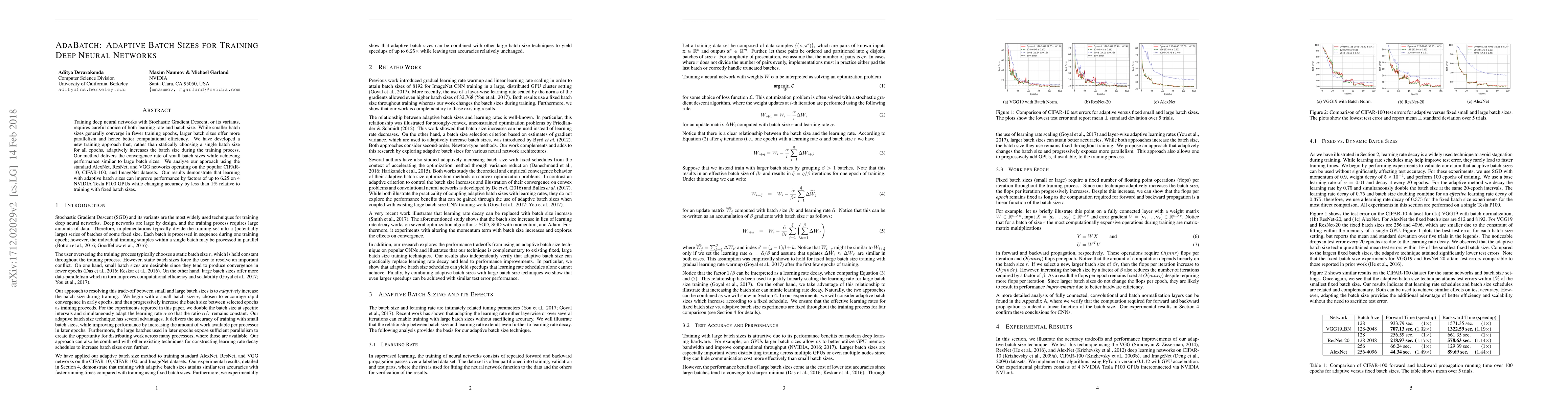 Title: AdaBatch: Adaptive Batch Sizes for Training Deep Neural Networks Summary: This paper introduces AdaBatch, a method that adaptively adjusts batch sizes during training to balance convergence speed and computational efficiency, achieving performance improvements of up to 6.25x on GPUs while maintaining accuracy.