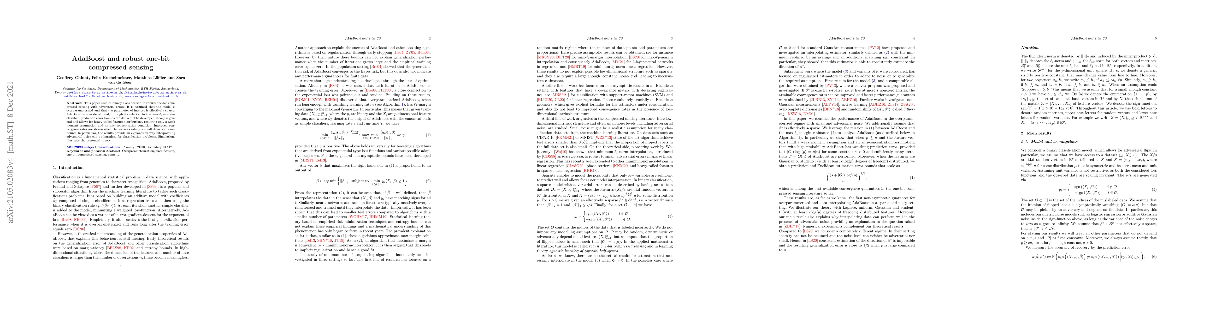 This paper explores the use of AdaBoost for binary classification in one-bit compressed sensing with adversarial errors, providing improved convergence rates and explaining why interpolating noise can be harmless.