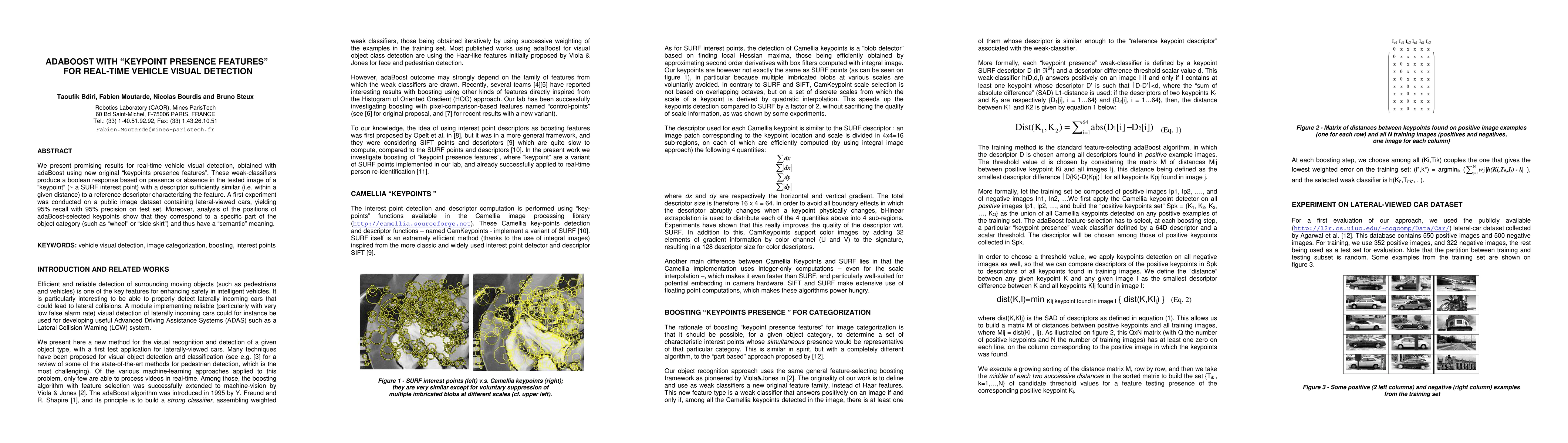 This paper uses adaBoost with "keypoint presence features" for real-time vehicle detection, achieving 95% recall and precision on a dataset of lateral-viewed cars. The keypoints, corresponding to specific object parts like wheels, provide semantic meaning to the detection process.