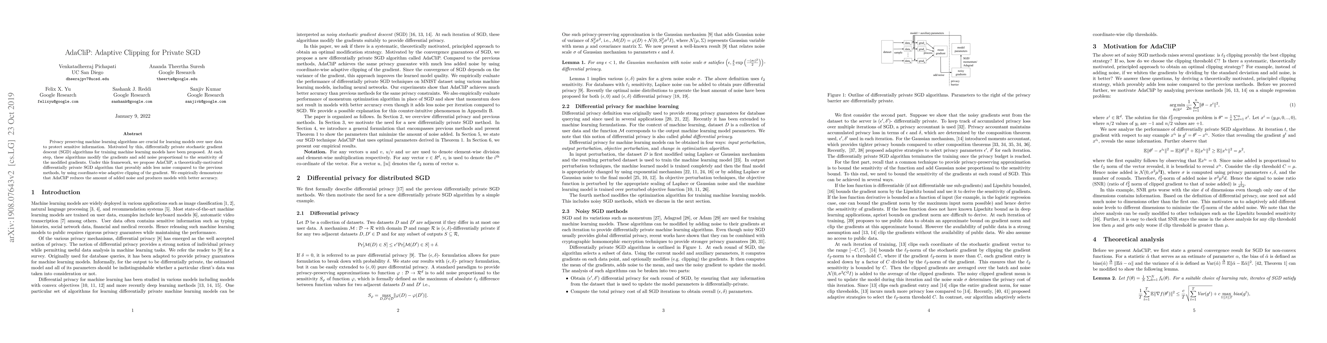 AdaCliP introduces a differentially private SGD algorithm that adaptively clips gradients to reduce noise, achieving better model accuracy while maintaining privacy. Empirical results show that AdaCliP outperforms previous methods by adding less noise.