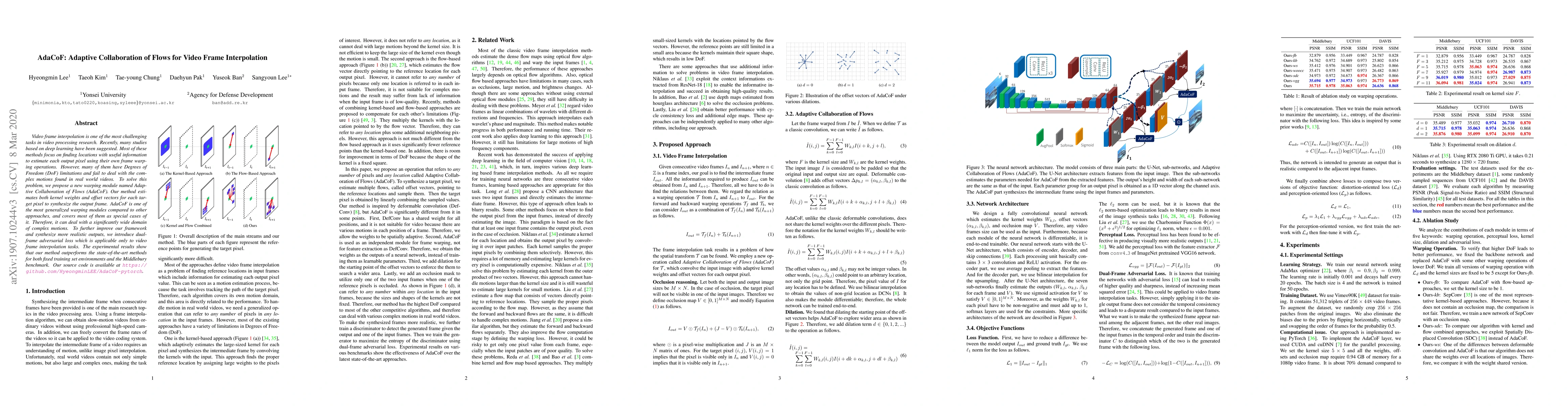 The paper proposes AdaCoF, an Adaptive Collaboration of Flows warping module for video frame interpolation, which estimates kernel weights and offset vectors to handle complex motions. It also introduces a dual-frame adversarial loss to enhance realism, outperforming existing methods in various benchmarks.