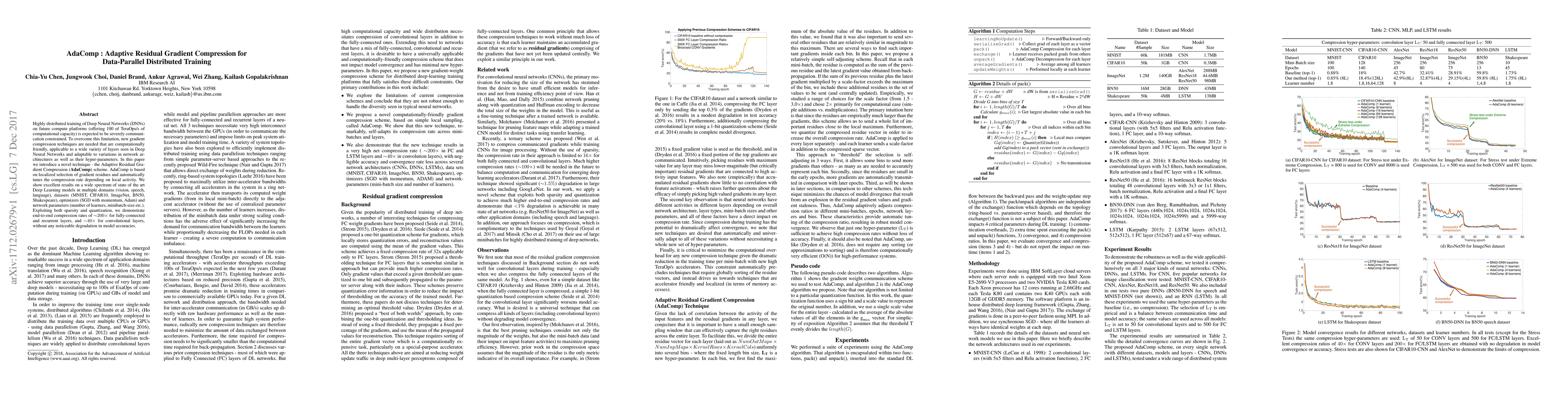 Researchers introduce AdaComp, a novel gradient compression technique for deep learning models that achieves high compression rates without sacrificing accuracy, suitable for various architectures and domains.