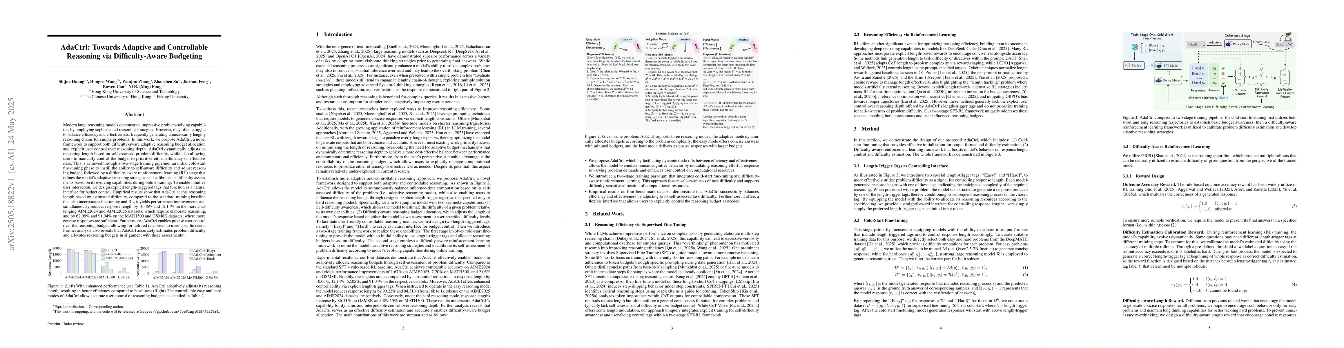 AdaCtrl adapts reasoning length based on problem difficulty, improving performance and reducing response length by 10-91% in challenging datasets, while enabling precise user control over the reasoning budget.