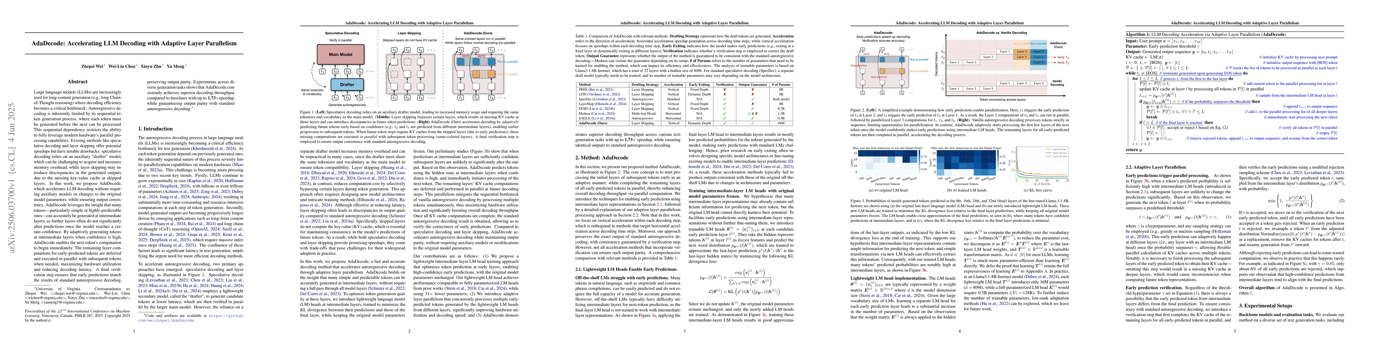 AdaDecode accelerates LLM decoding with adaptive layer parallelism, achieving up to 1.73x speedup while maintaining output parity with standard autoregressive decoding.