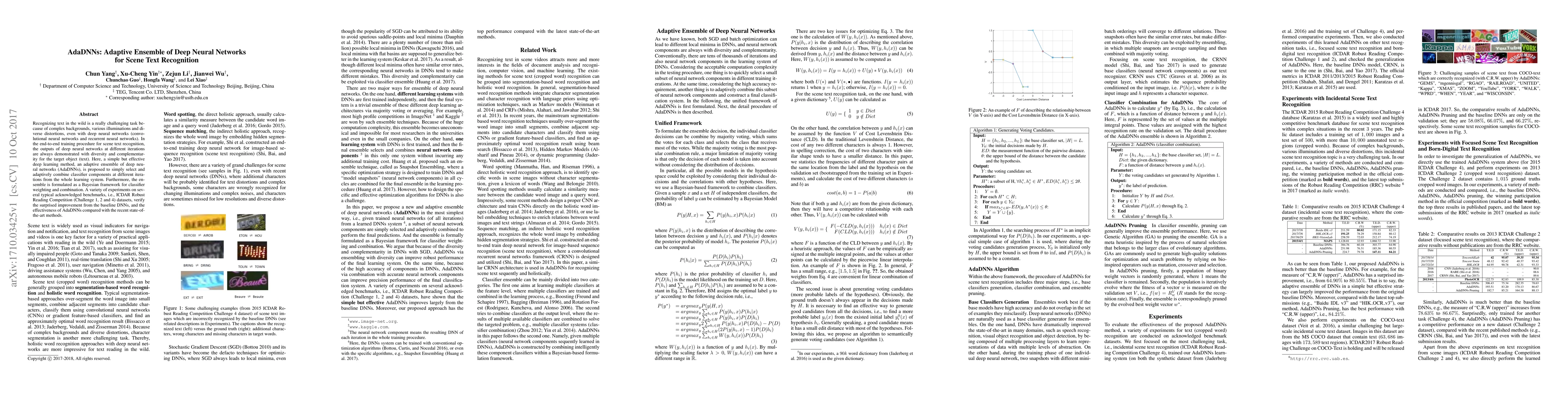 AdaDNNs proposes an adaptive ensemble of deep neural networks for improved scene text recognition, combining diverse classifier components at different training iterations within a Bayesian framework to outperform baseline deep neural networks and state-of-the-art methods on benchmark datasets.