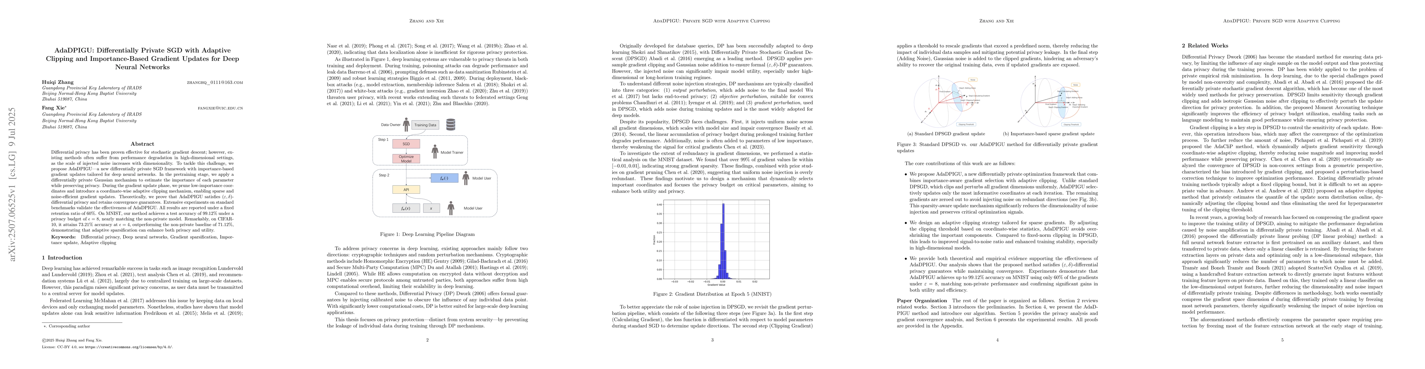 Differential privacy has been proven effective for stochastic gradient descent; however, existing methods often suffer from performance degradation in high-dimensional settings, as the scale of injected noise increases with dimensionality. To tackle this challenge, we propose AdaDPIGU--a new differentially private SGD framework with importance-based gradient updates tailored for deep neural networks. In the pretraining stage, we apply a differentially private Gaussian mechanism to estimate the importance of each parameter while preserving privacy. During the gradient update phase, we prune low-importance coordinates and introduce a coordinate-wise adaptive clipping mechanism, enabling sparse and noise-efficient gradient updates. Theoretically, we prove that AdaDPIGU satisfies $(\varepsilon, \delta)$-differential privacy and retains convergence guarantees. Extensive experiments on standard benchmarks validate the effectiveness of AdaDPIGU. All results are reported under a fixed retention ratio of 60%. On MNIST, our method achieves a test accuracy of 99.12% under a privacy budget of $\epsilon = 8$, nearly matching the non-private model. Remarkably, on CIFAR-10, it attains 73.21% accuracy at $\epsilon = 4$, outperforming the non-private baseline of 71.12%, demonstrating that adaptive sparsification can enhance both privacy and utility.