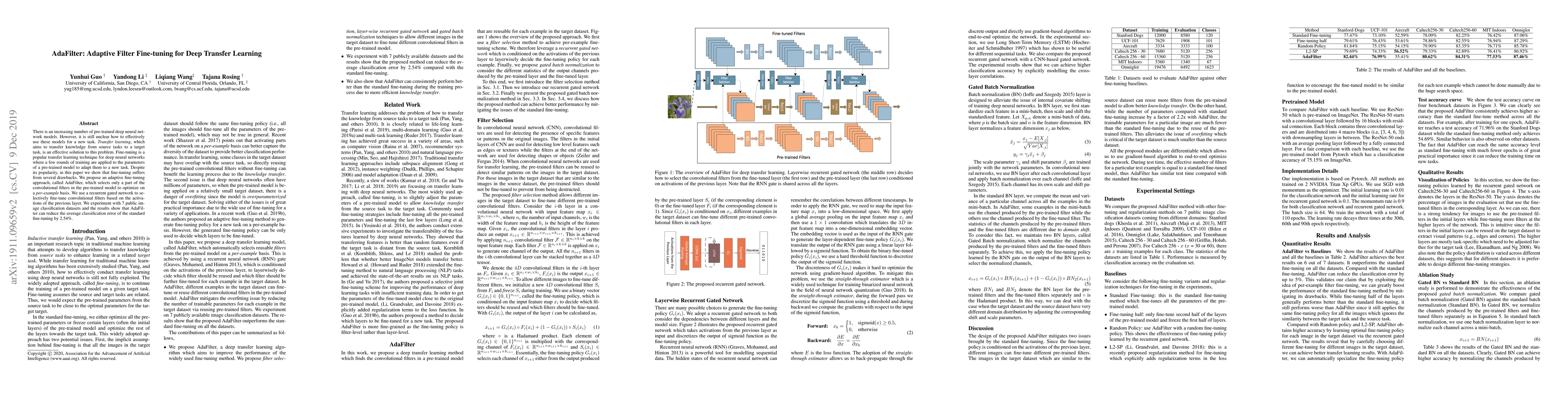 AdaFilter proposes an adaptive fine-tuning approach for deep transfer learning that selectively optimizes a subset of convolutional filters on a per-example basis using a recurrent gated network. Experimental results on 7 image classification datasets show AdaFilter reduces classification error by 2.54% compared to standard fine-tuning.