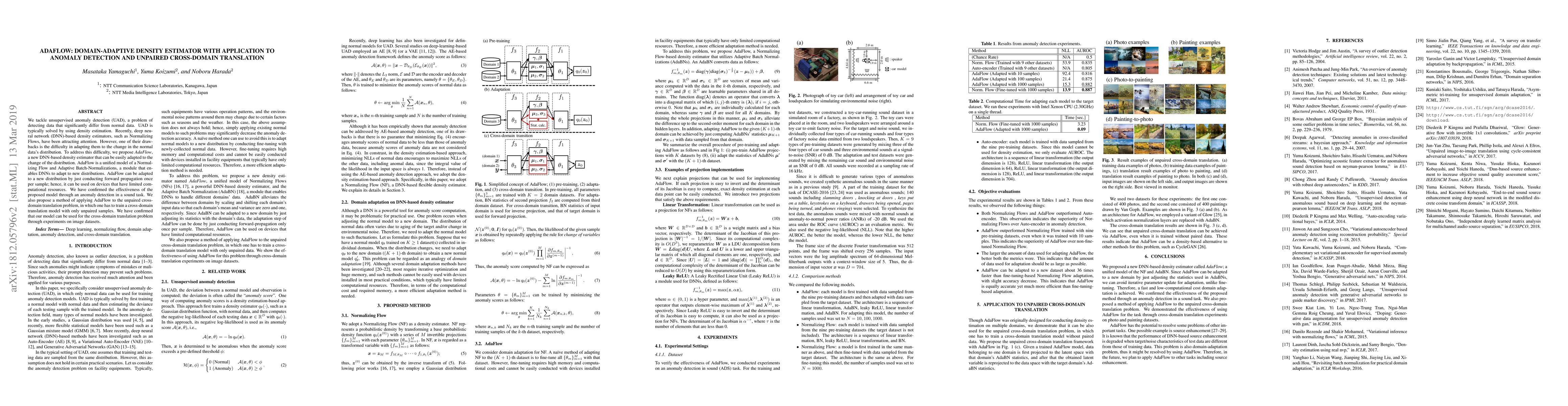 AdaFlow is a novel density estimator combining Normalizing Flows and Adaptive Batch-Normalizations for unsupervised anomaly detection and unpaired cross-domain translation, demonstrating adaptability to new distributions with minimal computational overhead. The model's effectiveness is validated through sound anomaly detection and image domain translation experiments.