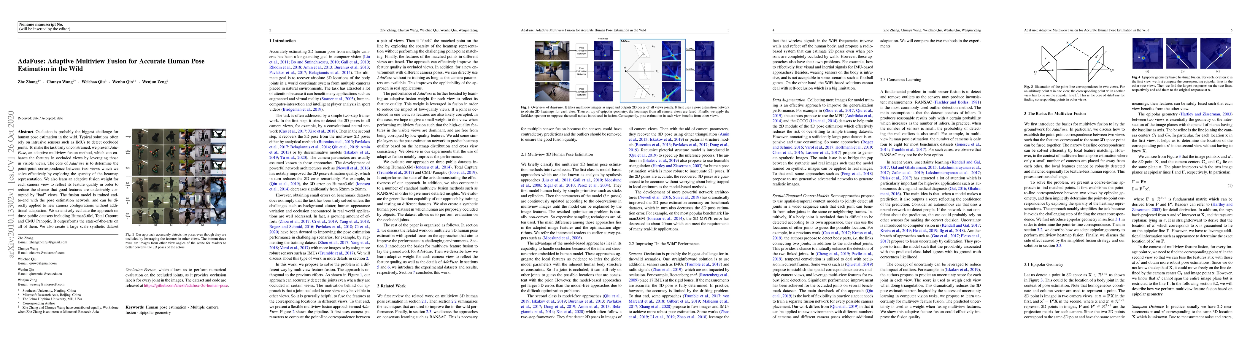 AdaFuse is an adaptive multiview fusion method designed to improve human pose estimation in challenging, occluded scenarios without intrusive sensors. It determines point-point correspondences between views and learns adaptive weights to enhance occluded views using visible ones, outperforming state-of-the-art methods on multiple datasets.