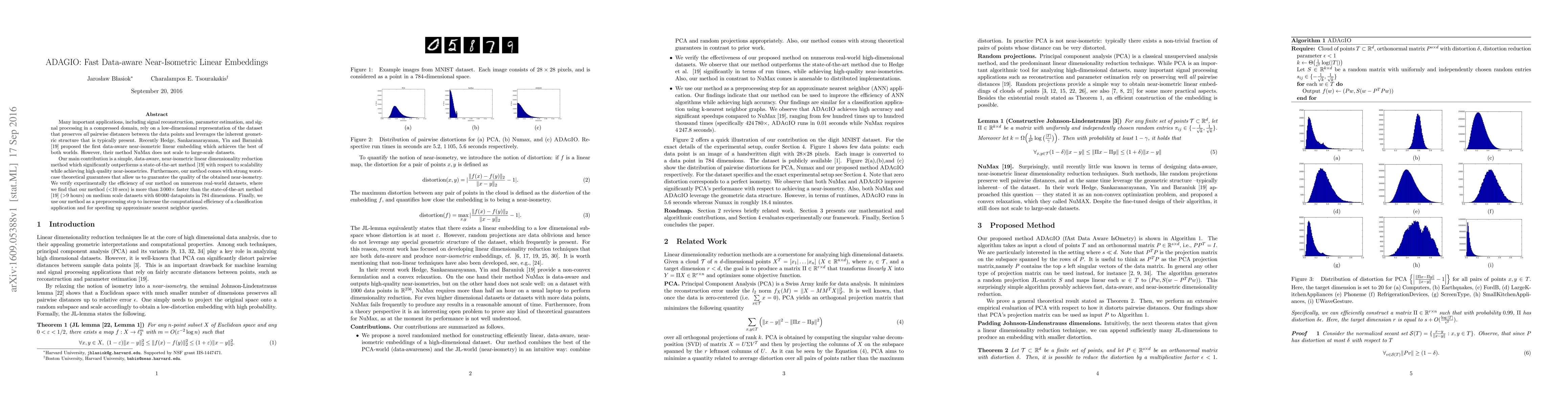 Many important applications, including signal reconstruction, parameter estimation, and signal processing in a compressed domain, rely on a low-dimensional representation of the dataset that preserves {\em all} pairwise distances between the data points and leverages the inherent geometric structure that is typically present. Recently Hedge, Sankaranarayanan, Yin and Baraniuk \cite{hedge2015} proposed the first data-aware near-isometric linear embedding which achieves the best of both worlds. However, their method NuMax does not scale to large-scale datasets. Our main contribution is a simple, data-aware, near-isometric linear dimensionality reduction method which significantly outperforms a state-of-the-art method \cite{hedge2015} with respect to scalability while achieving high quality near-isometries. Furthermore, our method comes with strong worst-case theoretical guarantees that allow us to guarantee the quality of the obtained near-isometry. We verify experimentally the efficiency of our method on numerous real-world datasets, where we find that our method ($<$10 secs) is more than 3\,000$\times$ faster than the state-of-the-art method \cite{hedge2015} ($>$9 hours) on medium scale datasets with 60\,000 data points in 784 dimensions. Finally, we use our method as a preprocessing step to increase the computational efficiency of a classification application and for speeding up approximate nearest neighbor queries.