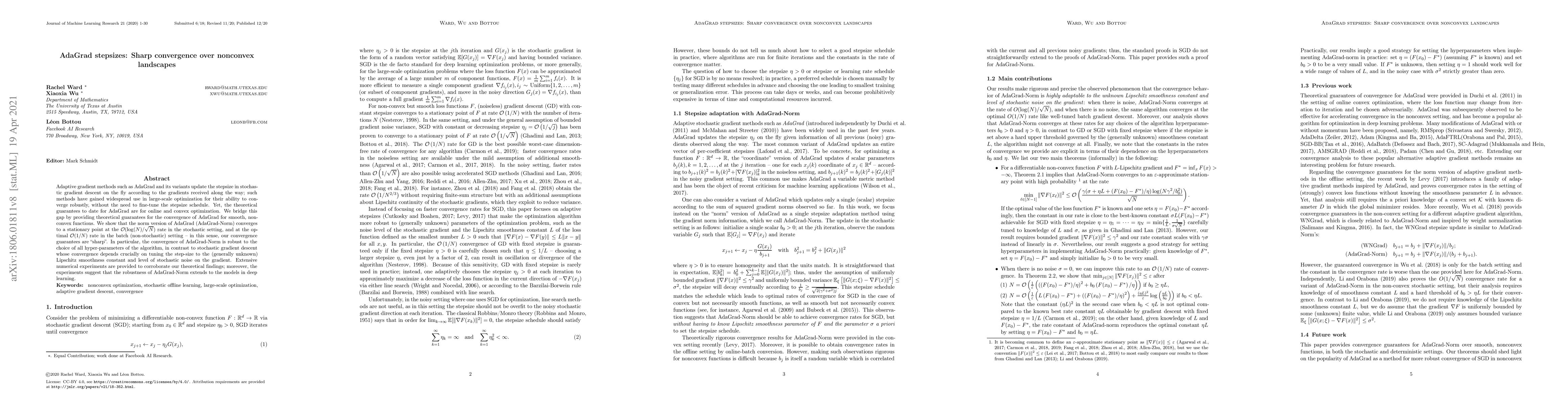 This paper provides theoretical guarantees for the convergence of AdaGrad on smooth, nonconvex optimization problems, demonstrating that AdaGrad-Norm converges to a stationary point at optimal rates in both stochastic and batch settings. The robustness of AdaGrad-Norm to hyperparameters is highlighted, contrasting it with the sensitivity of stochastic gradient descent to step-size tuning.