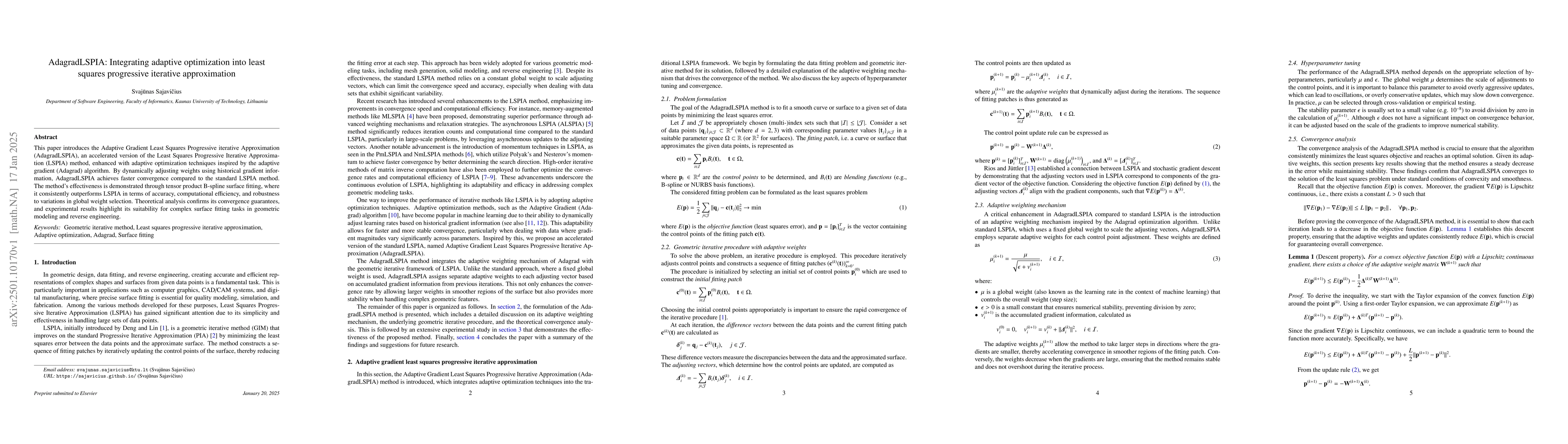 AdagradLSPIA combines adaptive optimization with the Least Squares Progressive Iterative Approximation method for faster convergence. It dynamically adjusts weights using historical gradient information, leading to superior accuracy, computational efficiency, and robustness in tensor product B-spline surface fitting compared to standard LSPIA.