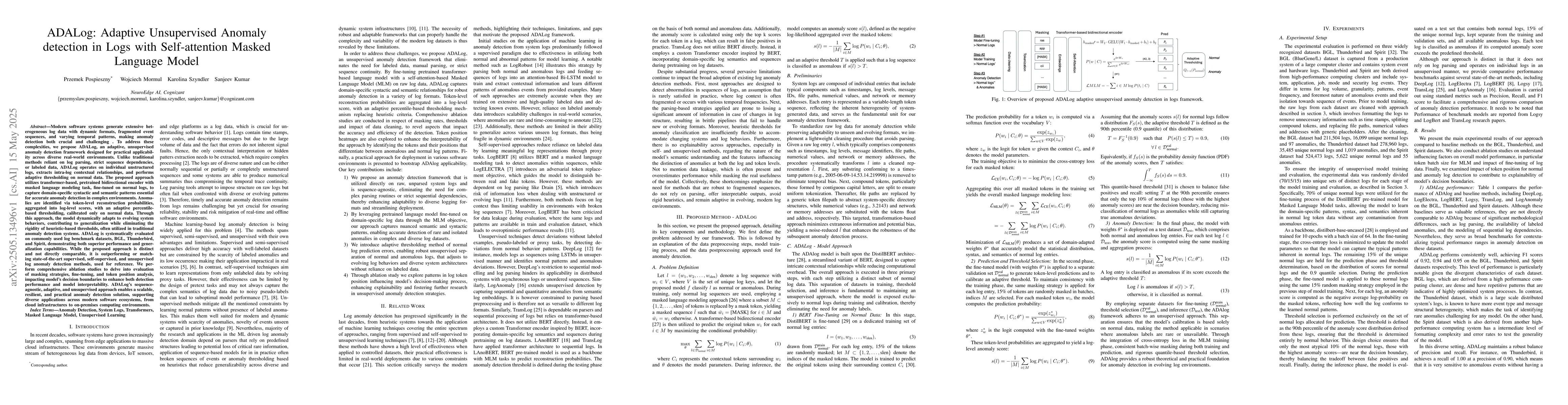 ADALog employs an adaptive, unsupervised anomaly detection framework that operates on individual unstructured logs, extracting contextual relationships using a transformer-based pretrained bidirectional encoder fine-tuned via masked language modeling on normal logs. It identifies anomalies through token-level reconstruction probabilities, aggregated into log-level scores, with adaptive percentile-based thresholding calibrated only on normal data.
