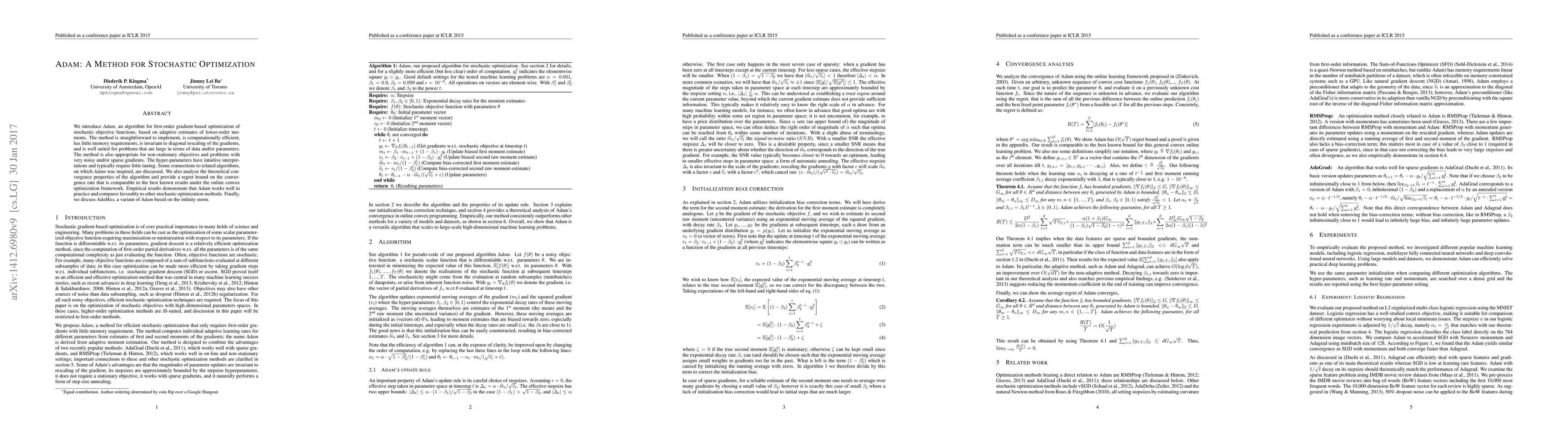 We introduce Adam, an algorithm for first-order gradient-based optimization of stochastic objective functions, based on adaptive estimates of lower-order moments. The method is straightforward to implement, is computationally efficient, has little memory requirements, is invariant to diagonal rescaling of the gradients, and is well suited for problems that are large in terms of data and/or parameters. The method is also appropriate for non-stationary objectives and problems with very noisy and/or sparse gradients. The hyper-parameters have intuitive interpretations and typically require little tuning. Some connections to related algorithms, on which Adam was inspired, are discussed. We also analyze the theoretical convergence properties of the algorithm and provide a regret bound on the convergence rate that is comparable to the best known results under the online convex optimization framework. Empirical results demonstrate that Adam works well in practice and compares favorably to other stochastic optimization methods. Finally, we discuss AdaMax, a variant of Adam based on the infinity norm.