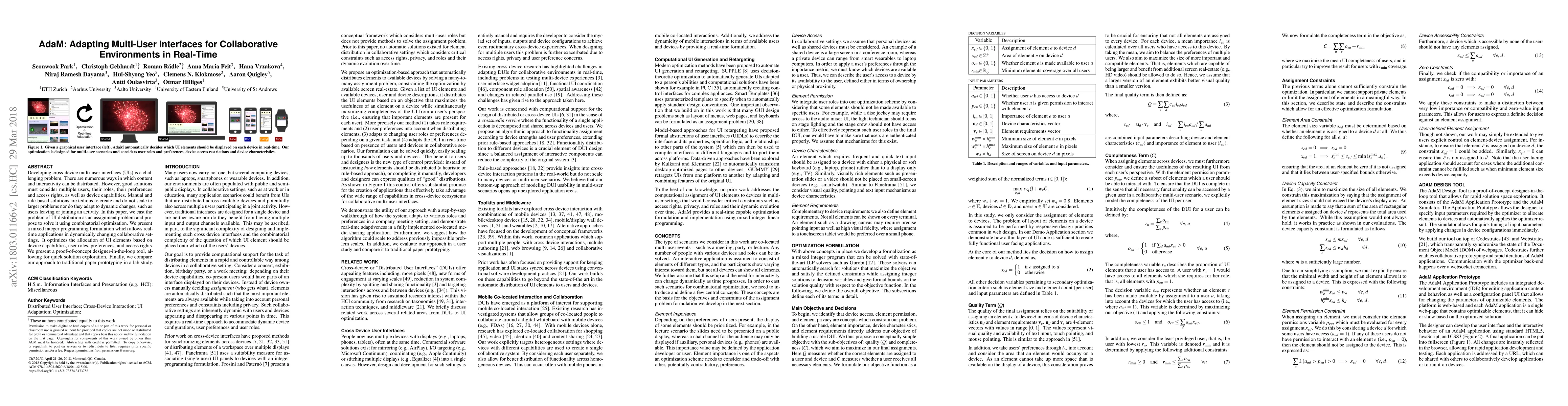 Developing cross-device multi-user interfaces (UIs) is a challenging problem. There are numerous ways in which content and interactivity can be distributed. However, good solutions must consider multiple users, their roles, their preferences and access rights, as well as device capabilities. Manual and rule-based solutions are tedious to create and do not scale to larger problems nor do they adapt to dynamic changes, such as users leaving or joining an activity. In this paper, we cast the problem of UI distribution as an assignment problem and propose to solve it using combinatorial optimization. We present a mixed integer programming formulation which allows real-time applications in dynamically changing collaborative settings. It optimizes the allocation of UI elements based on device capabilities, user roles, preferences, and access rights. We present a proof-of-concept designer-in-the-loop tool, allowing for quick solution exploration. Finally, we compare our approach to traditional paper prototyping in a lab study.
