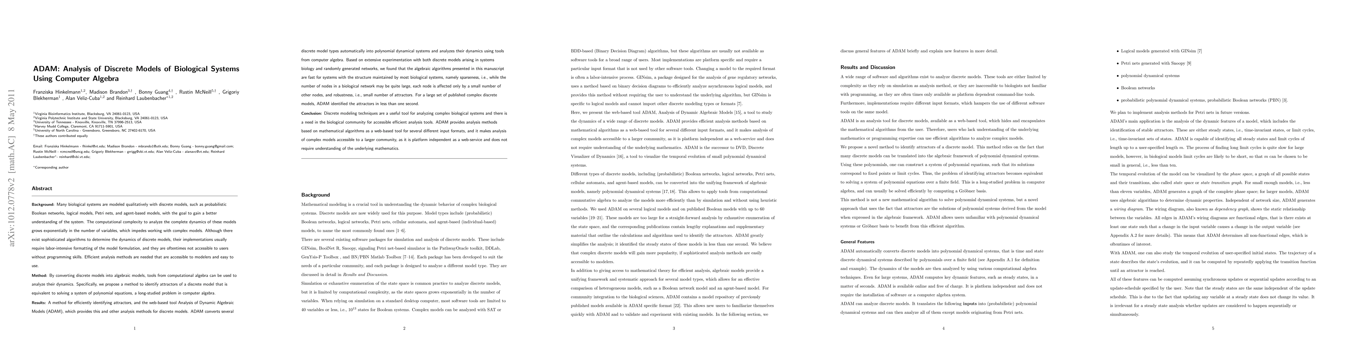 The paper proposes ADAM, a method for analyzing discrete biological models using computational algebra to identify attractors by solving polynomial equations. The web-based tool ADAM efficiently converts various discrete models into algebraic forms and leverages computer algebra techniques, proving effective for sparse and robust biological networks.