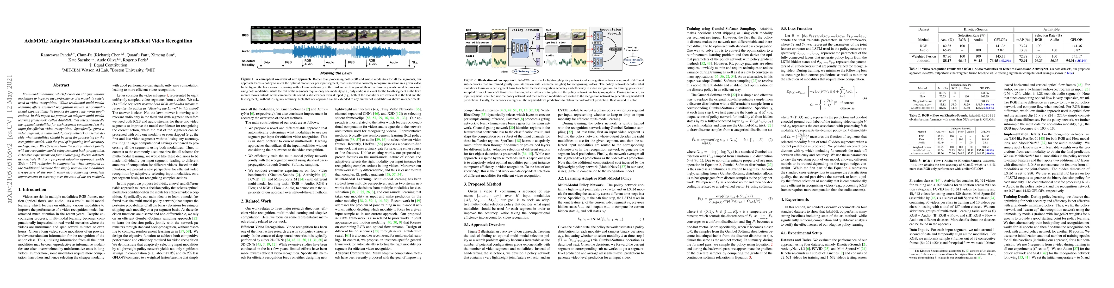 AdaMML proposes an adaptive multi-modal learning framework to efficiently select optimal modalities for video recognition, achieving a 35%-55% reduction in computation while improving accuracy over traditional methods. The framework uses a policy network to dynamically choose modalities based on input segments, trained jointly with the recognition model.