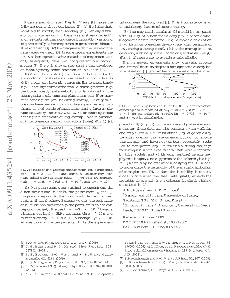Adams and Olmsted respond to Wang's critique, clarifying that nonquiescent relaxation can occur without a stress gradient and defending the parameter values used in their model. They emphasize that their study focused on step strains that developed inhomogeneities before flow cessation.