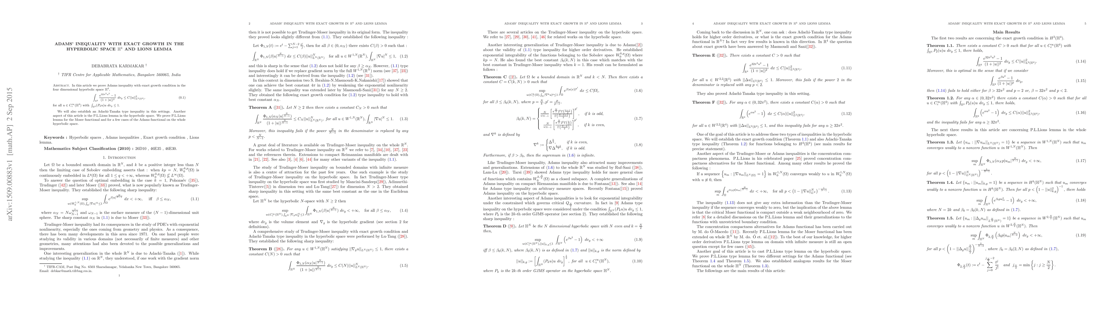 In this article we prove Adams inequality with exact growth condition in the four dimensional hyperbolic space $\mathbb{H}^4,$ \begin{align} \int_{\mathbb{H}^4} \frac{e^{32 \pi^2 u^2} - 1}{(1 + |u|)^2} \ dv_g \leq C ||u||^2_{L^2({\mathbb{H}^4})}. \end{align} for all $u \in C^{\infty}_c(\mathbb{H}^4) $ with $\int_{\mathbb{H}^4} (P_2 u) u \ dv_g \leq 1.$ We will also establish an Adachi-Tanaka type inequality in this settings. Another aspect of this article is the P.L.Lions lemma in the hyperbolic space. We prove P.L.Lions lemma for the Moser functional and for a few cases of the Adams functional on the whole hyperbolic space.