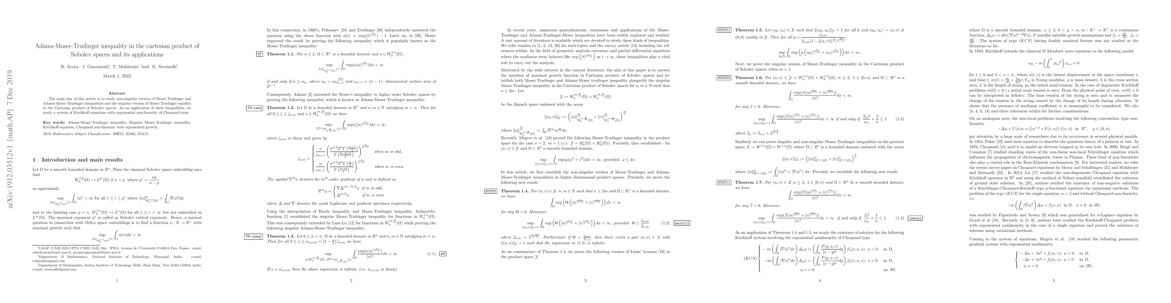The main aim of this article is to study non-singular version of Moser-Trudinger and Adams-Moser-Trudinger inequalities and the singular version of Moser-Trudinger equality in the Cartesian product of Sobolev spaces. As an application of these inequalities, we study a system of Kirchhoff equations with exponential non-linearity of Choquard type.