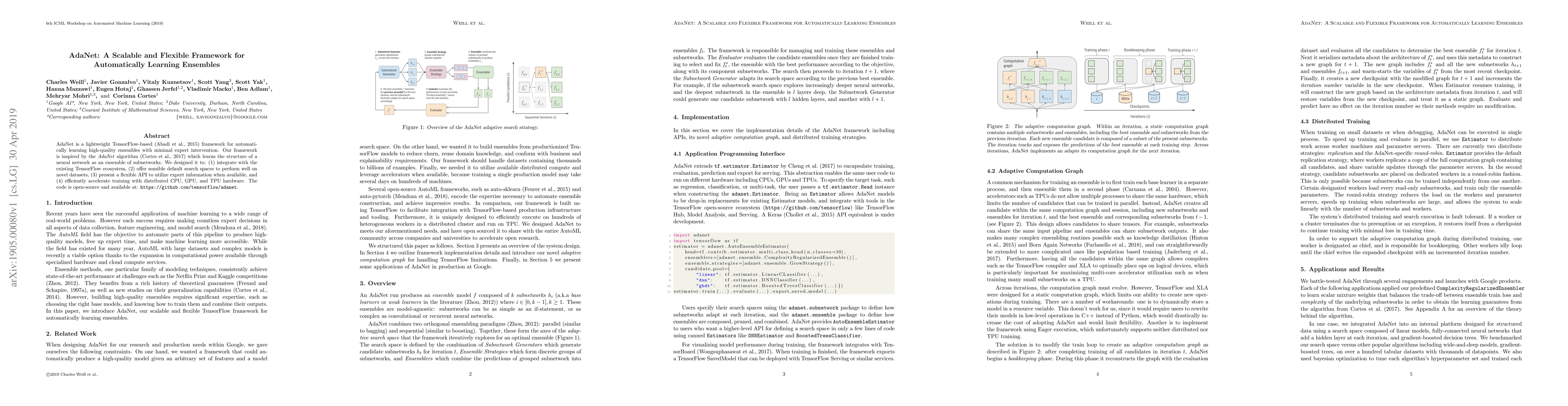 AdaNet is a TensorFlow-based framework for automatically learning high-quality neural network ensembles with minimal expert intervention. It integrates seamlessly with TensorFlow, offers sensible default search spaces, and efficiently accelerates training across various hardware.