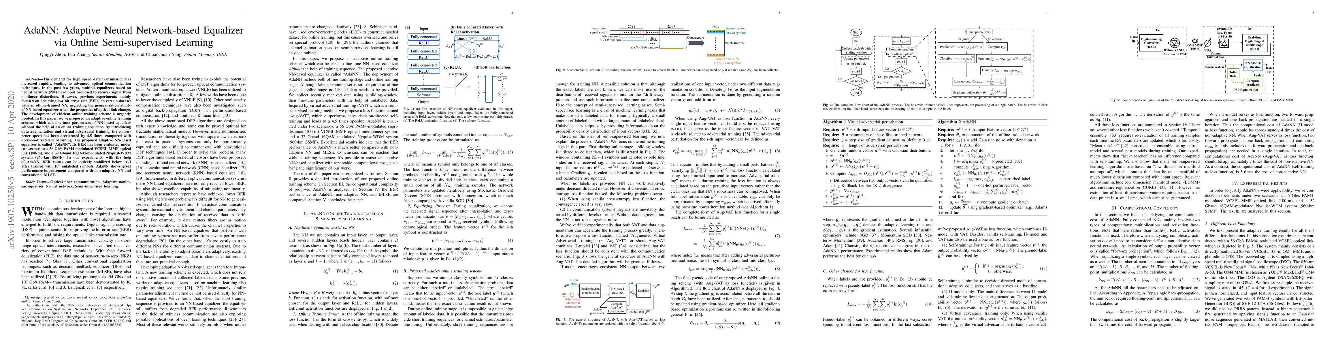 AdaNN proposes an adaptive online training scheme for neural network-based equalizers to enhance signal recovery from nonlinear distortions in optical communication. The method significantly improves convergence speed and generalization ability through data augmentation and virtual adversarial training, achieving stable low bit error rates with minimal labeled data.