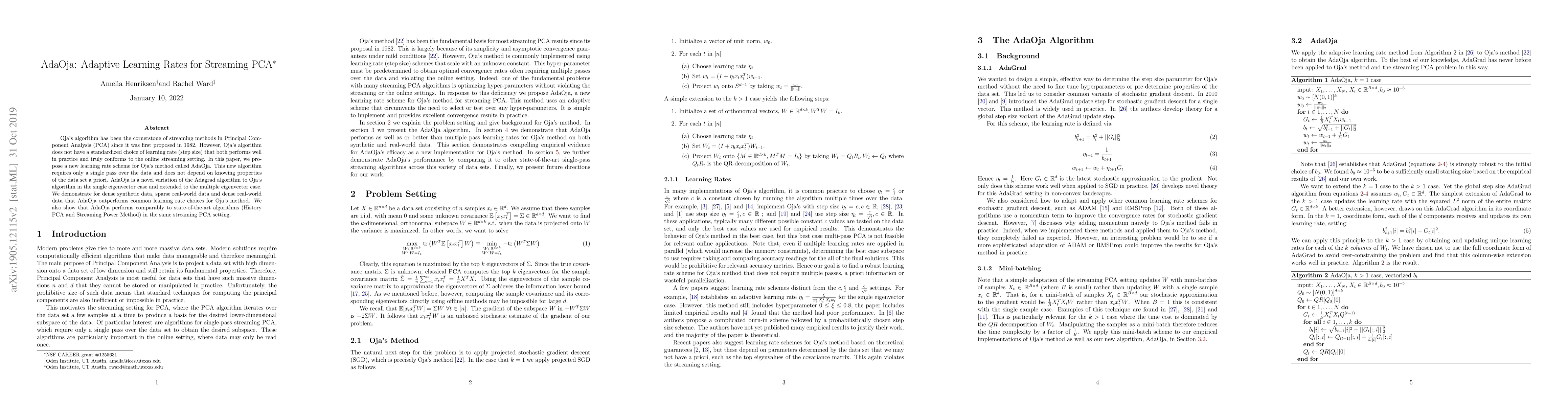 This paper introduces AdaOja, an adaptive learning rate scheme for Oja's algorithm in streaming PCA, which outperforms traditional learning rate choices and performs comparably to state-of-the-art algorithms without requiring prior knowledge of the dataset.