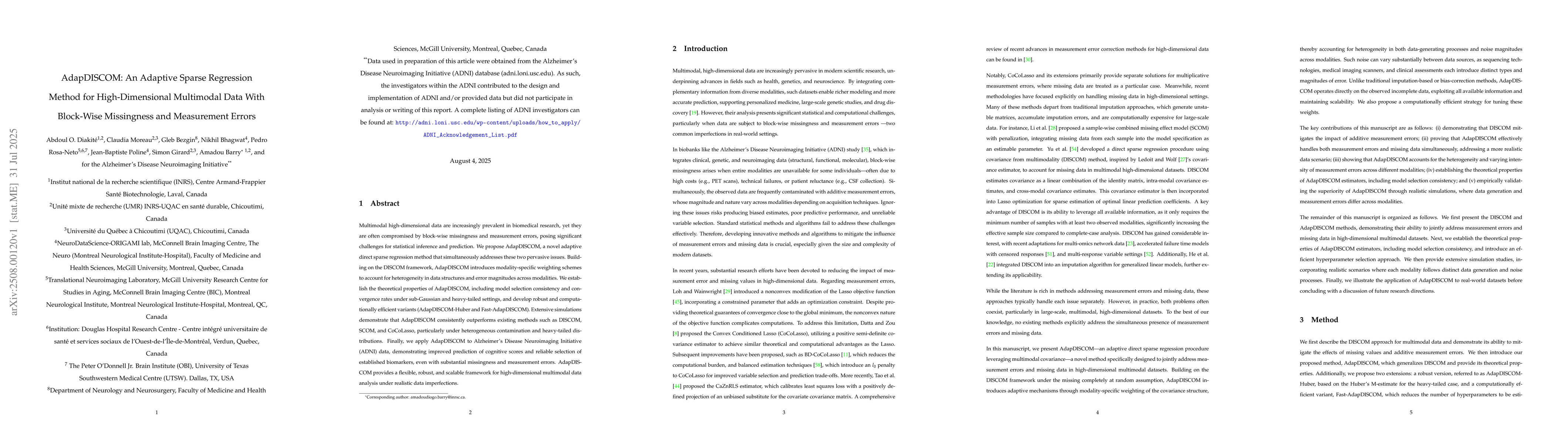 Multimodal high-dimensional data are increasingly prevalent in biomedical research, yet they are often compromised by block-wise missingness and measurement errors, posing significant challenges for statistical inference and prediction. We propose AdapDISCOM, a novel adaptive direct sparse regression method that simultaneously addresses these two pervasive issues. Building on the DISCOM framework, AdapDISCOM introduces modality-specific weighting schemes to account for heterogeneity in data structures and error magnitudes across modalities. We establish the theoretical properties of AdapDISCOM, including model selection consistency and convergence rates under sub-Gaussian and heavy-tailed settings, and develop robust and computationally efficient variants (AdapDISCOM-Huber and Fast-AdapDISCOM). Extensive simulations demonstrate that AdapDISCOM consistently outperforms existing methods such as DISCOM, SCOM, and CoCoLasso, particularly under heterogeneous contamination and heavy-tailed distributions. Finally, we apply AdapDISCOM to Alzheimers Disease Neuroimaging Initiative (ADNI) data, demonstrating improved prediction of cognitive scores and reliable selection of established biomarkers, even with substantial missingness and measurement errors. AdapDISCOM provides a flexible, robust, and scalable framework for high-dimensional multimodal data analysis under realistic data imperfections.