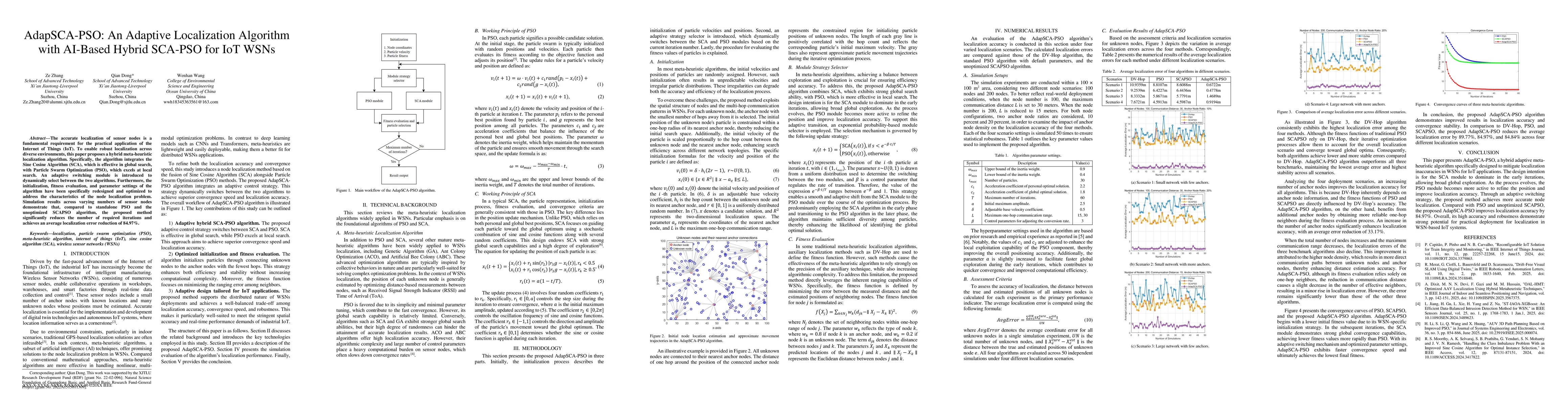 The novelty of this work lies in the adaptive switching mechanism between SCA and PSO, tailored initialization, and optimized fitness evaluation and parameter settings specifically designed for the node localization problem in IoT WSNs.