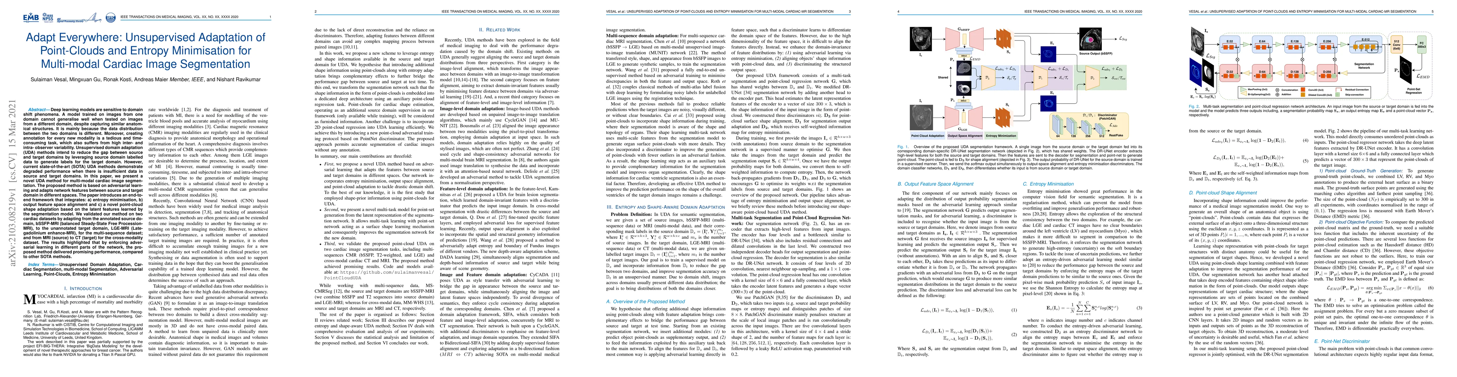 This paper presents a novel unsupervised domain adaptation method for multi-modal cardiac image segmentation, integrating entropy minimisation, feature space alignment, and point-cloud shape adaptation. The approach effectively bridges the gap between annotated and unannotated domains, demonstrating improved performance over state-of-the-art methods.