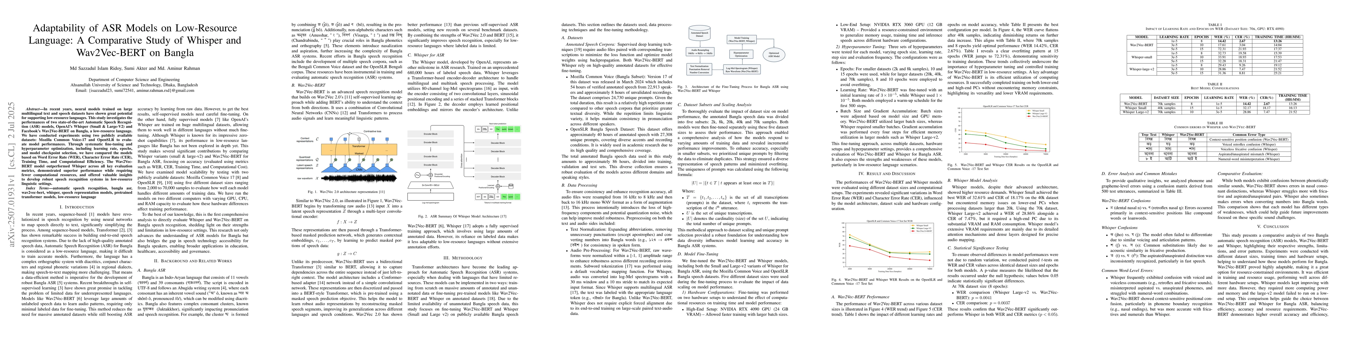 In recent years, neural models trained on large multilingual text and speech datasets have shown great potential for supporting low-resource languages. This study investigates the performances of two state-of-the-art Automatic Speech Recognition (ASR) models, OpenAI's Whisper (Small & Large-V2) and Facebook's Wav2Vec-BERT on Bangla, a low-resource language. We have conducted experiments using two publicly available datasets: Mozilla Common Voice-17 and OpenSLR to evaluate model performances. Through systematic fine-tuning and hyperparameter optimization, including learning rate, epochs, and model checkpoint selection, we have compared the models based on Word Error Rate (WER), Character Error Rate (CER), Training Time, and Computational Efficiency. The Wav2Vec-BERT model outperformed Whisper across all key evaluation metrics, demonstrated superior performance while requiring fewer computational resources, and offered valuable insights to develop robust speech recognition systems in low-resource linguistic settings.